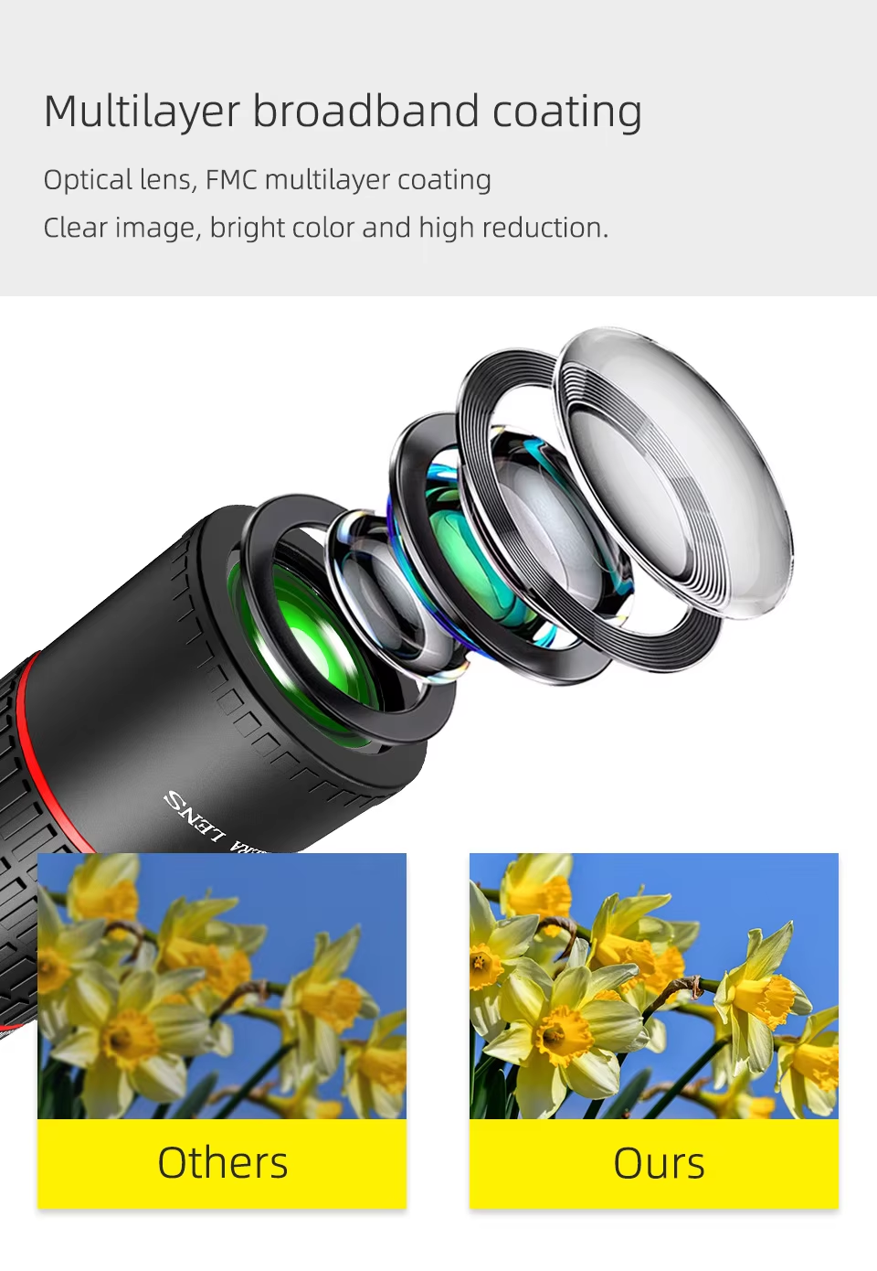 Equipped with FMC multi - layer broadband coated optical glass, this lens ensures exceptional image clarity, vibrant colors, and high - fidelity color reproduction. Say goodbye to dull, blurry images—every shot is a masterpiece of detail and color.